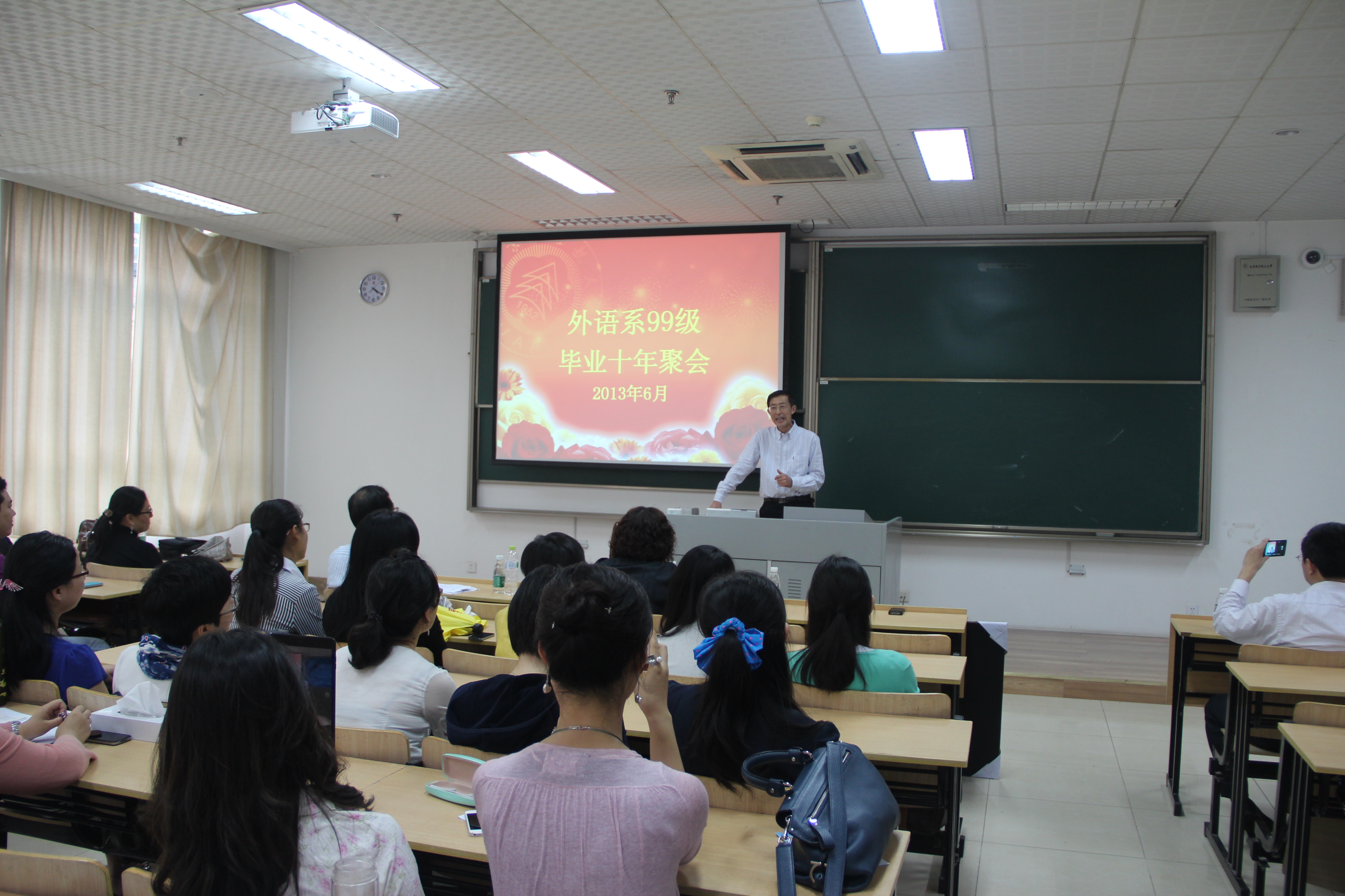 2013年6月11日,dg百家乐在线试玩平台 99级校友毕业十年重返母校活动在明故宫校区进行,此次活动共包括校园漫步、主题班会、回味南航、校史参观、重温课堂、师生欢聚等环节。来自英语(国际贸易)专业的129911、129912班和英语(民航业务)专业的129981、129982班的共计40余位校友在毕业十年后再次相聚在共同学习生活了四年的母校,重温同窗情谊,共话师生恩情。