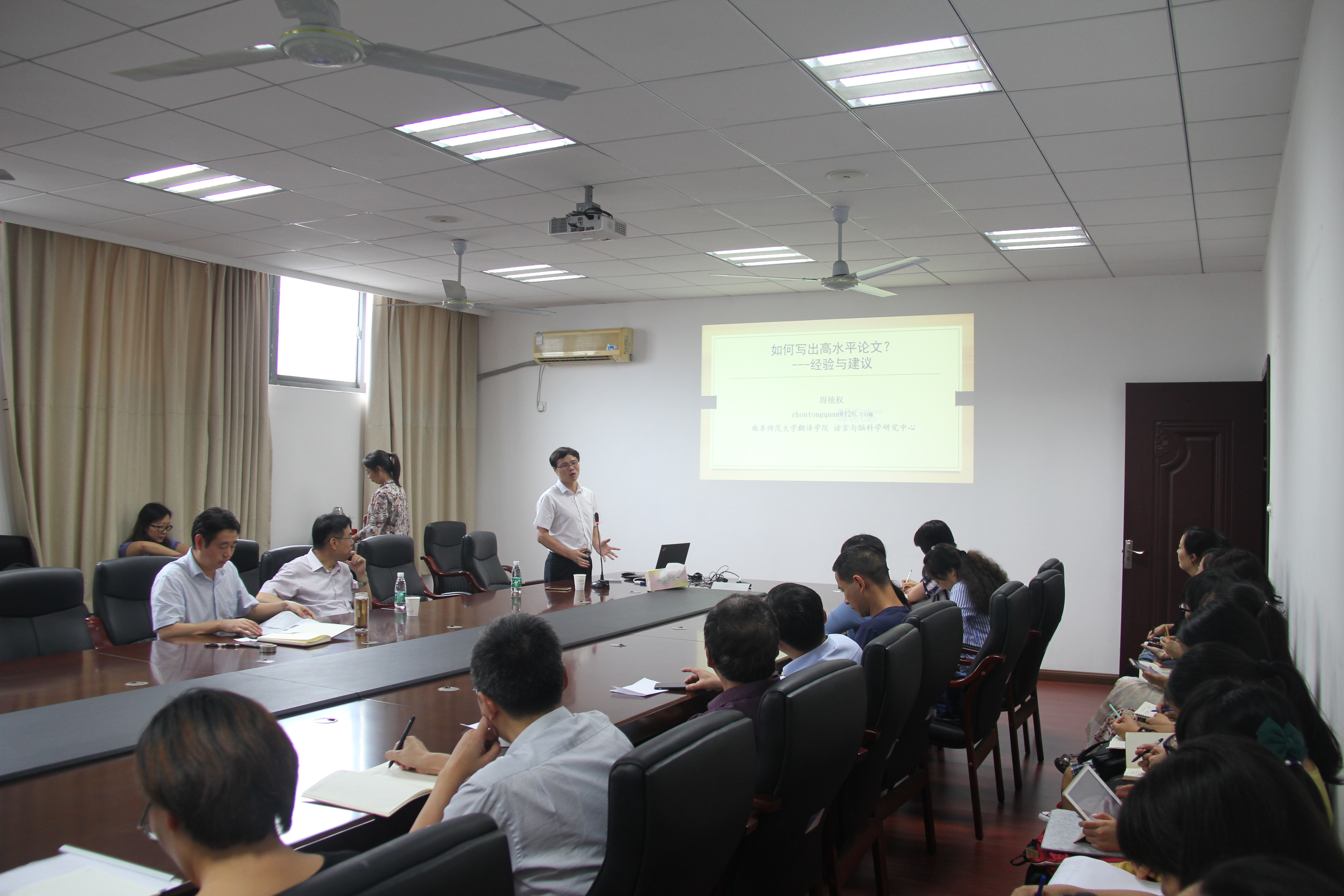 9月20日,曲阜师范大学翻译dg百家乐试玩 博士生导师周统权教授应邀在dg百家乐在线试玩平台 做了题为“从学术论文写作到科研项目申报”的精彩学术报告。dg百家乐在线试玩平台 副院长徐以中教授主持报告会。dg百家乐试玩 40余位教师聆听了报告。