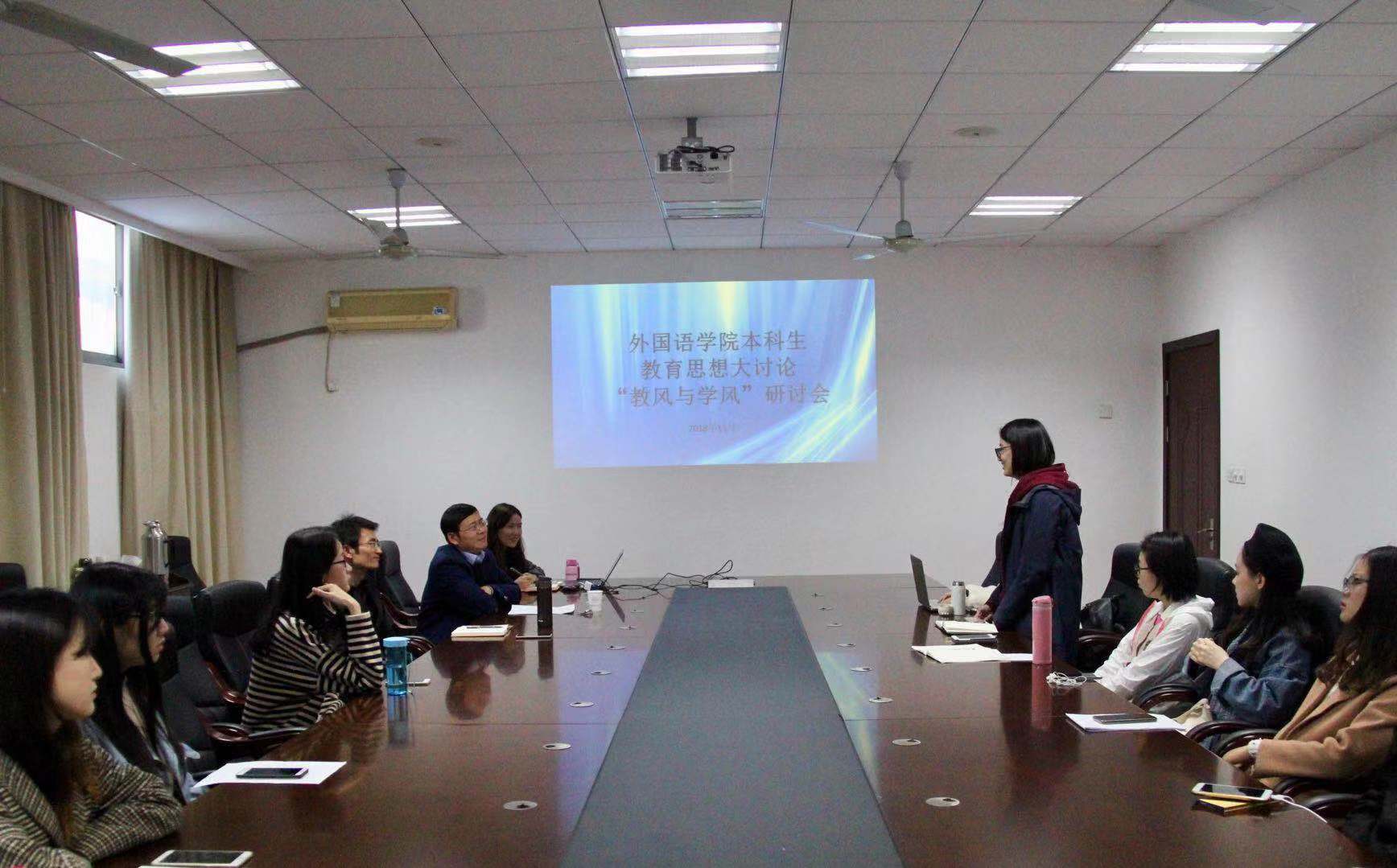 11月9日下午,dg百家乐在线试玩平台 本科生各年级开展了2场教风与学风专题研讨会,英语系主任姜礼福老师、白雪花老师,日语系钟勇老师,各年级辅导员,各班班长、学习委员及学生代表参加了本次研讨会,就如何更好助力dg百家乐在线试玩平台 学风教风建设发展进行了深入的交流和讨论。
