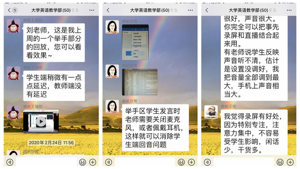 院教学办用小程序统一制定了在线教学学生反馈表,保证每人每门课程在开课第一周不同时段获得足够数量的教学评价和意见反馈,一旦发现某门课程需要改进就反馈给任课老师。院督导组抽查听取新教师课程并进行反馈,此外,很多任课老师也用自己的方式倾听学生意见。教学相长,得到反馈后,老师们会迅速调整,提升教学效果,比如有的老师改善了录音条件,有的老师购置了高级麦克风,有的老师加强对在线工具的操练……广大学生普遍认可特殊条件下的在线教学模式,毫不吝啬地对每一位任课老师给予了许多好评,有学生直呼“课堂效果完美”、“老师教学能力强,我们很爱她”、“继续保持就很棒!超喜欢Amanda!”而不少老师也表示乐意得到反馈意见,以便及时提高。