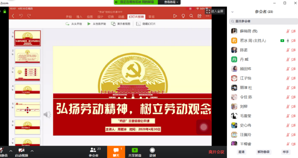 各团支部陆续开展线上“劳动”主题新思想公开课,旨在引导外院青年崇尚劳动、尊重劳动,激发青年学生劳动意识与责任担当。