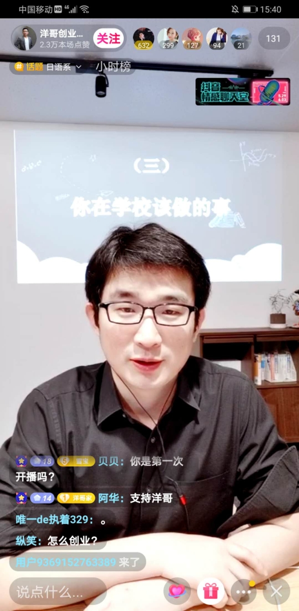 5月31日下午,日语系精品企业课程《科技文化创新创想》第三讲通过抖音平台开启,主讲人为日语系03级刘洋学长,现为谷町君CEO,同时也是南航dg百家乐在线试玩平台 繁星・谷町君奖学金资助者。