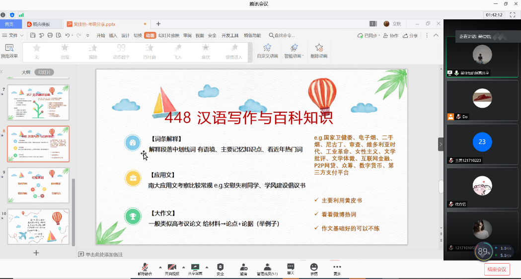 在考研专题分享会中,考取了南航笔译、南航语言学、南大英语笔译、复旦法硕(非法)和调剂至河北大学中国语言文学的5位优秀学姐,先后为同学们细致讲述了亲身备考经历,其中涵盖了包括择校考量、时间规划、推荐用书和潜在问题提醒在内的各方面经验分享,参加分享会的五十多位同学与学姐们积极互动提问,收获颇丰。