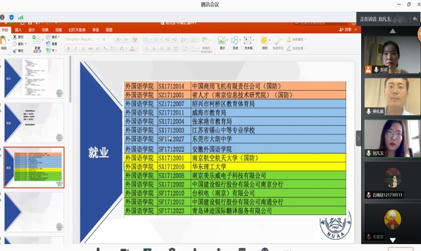 随后,彭欢对“准毕业生”进行就业动员,她为大家展示了dg百家乐试玩 近六年学生的考研、保研、就业、留学数据和学生地域分布图,详细地展示了不同方向发展的可能性,提醒学生们及时关注招聘信息发布,拓宽信息获取渠道,把握机会;同时对学生居家学习期间的心态表示理解,勉励学生们从个人实际情况出发,准确定位,早做准备,充分把握、合理利用大三暑假的关键时间,实现自己的目标。