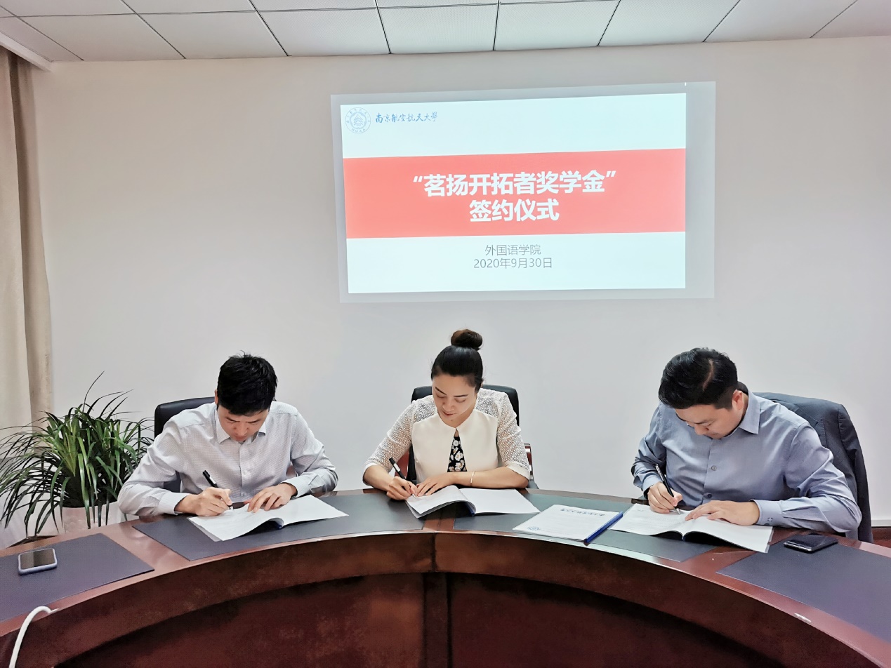 会谈结束后,双方举行了“茗扬开拓者奖学金”签约仪式,在与会人员的见证下,冯科茗、谢志扬和梁薇分别在协议上郑重签字。
