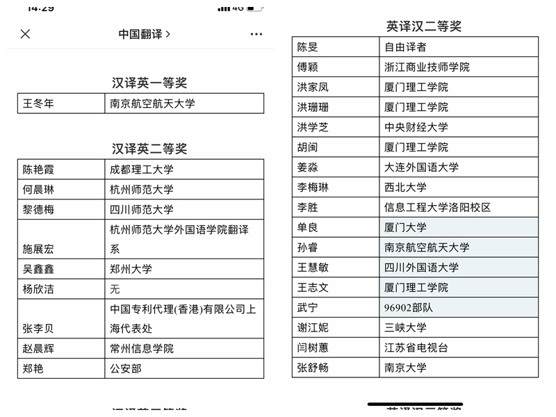 dg百家乐在线试玩平台 高度重视此项赛事,鼓励支持学生积极参与其中。2015-2019年间,学生共获得英译汉二等奖2项,三等奖2项,优秀奖15项,汉译英优秀奖3项。本次汉译英一等奖更是实现了历史性突破。获奖的两位同学表示,成绩的取得离不开dg百家乐试玩 提供的丰富的实习实践机会,以及专业教师在课堂内外的悉心教导。