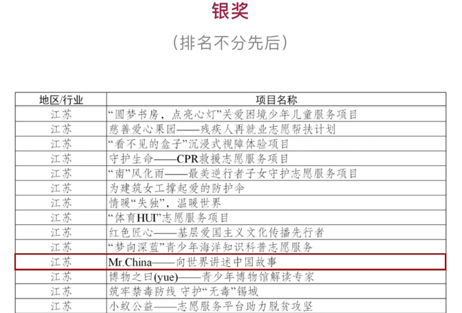 11月22日-24日,第五届中国青年志愿服务项目大赛全国赛终评在广东省东莞市举行。本届大赛由共青团中央、中央文明办、民政部等7部委共同主办。赛会全国组委会秘书处共收到38个省级赛会单位和行业赛主办单位推报的项目1202个,其中1000个项目进入终评评审。通过项目团队线上路演答辩、评委监委线下集中评审的方式,评选出金奖项目150个、银奖项目350个及铜奖项目500个。dg百家乐在线试玩平台 “Mr.China——向世界讲述中国故事”团队在本次大赛中为学校再创佳绩,取得了银奖的优异成绩。
