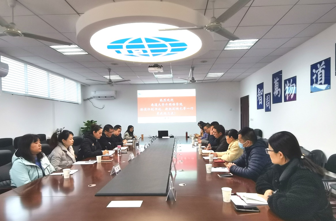 12月2日,南通大学dg百家乐在线试玩平台 党委副书记陈俊怀、副院长徐托等一行来dg百家乐在线试玩平台 调研。院长范祥涛、副院长徐以中、党委副书记梁薇、副院长姜礼福、大学外语教学部主任徐智鑫,研究生外语教学部主任陆红、dg百家乐试玩 党政办相关人员出席座谈会。