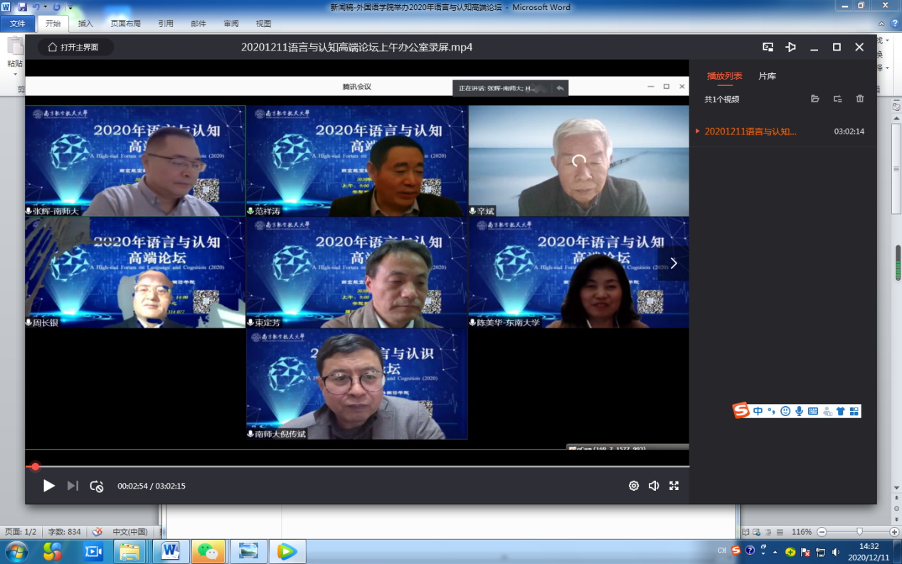 12月11日,2020年语言与认知高端论坛在我校dg百家乐在线试玩平台 国际会议中心举行,论坛报告由上海外国语大学、南京大学等国内知名高校的语言学专家领衔主讲,来自全国的学者及师生近300人通过线下或线上方式参加了本次论坛。