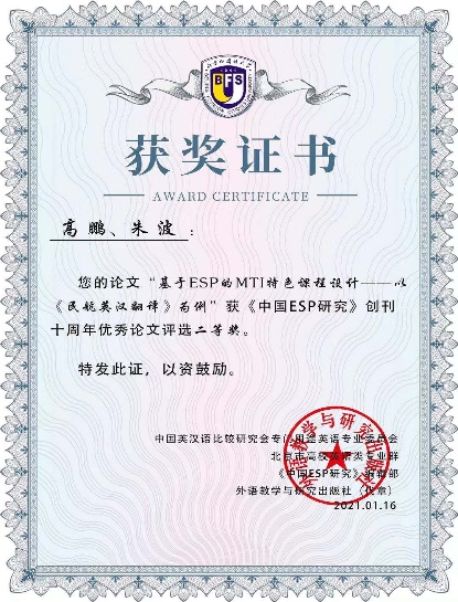 会议公布了《中国ESP研究》创刊10周年优秀论文一、二、三等奖获奖名单并进行了隆重表彰。经专家组匿名投票评选,dg百家乐在线试玩平台 翻译硕士专业学位(MTI)研究生高鹏与导师朱波教授合作撰写的论文《基于 ESP 的 MTI 特色课程设计——以“民航英汉翻译”为例》(载第19辑)荣获二等奖。论文以dg百家乐在线试玩平台 “民航英汉翻译”课程为例,展现设计方案、实施流程、课程特色,探讨结合空难纪录片、依托 ESP 基本原则,通过新材料、新方法、新理念和新领域等方面,面向民航业培养高层次、应用型、专业性口笔译人才,以推动行业发展,建设空中交通强国。