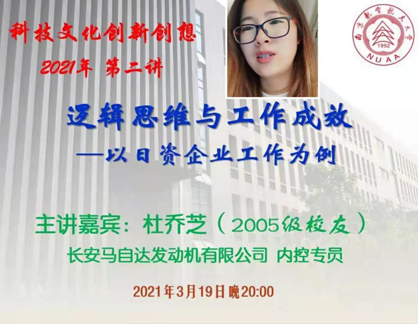 3月19日,dg百家乐在线试玩平台 日语系科技文化创新创想课程第二讲通过腾讯会议模式开启,主题为《逻辑思维与工作成效—以日资企业工作为例》,主讲人为南航2005级校友杜芝乔,曾任南京长安马自达发动机有限公司总裁助理,现任该公司内控专员。