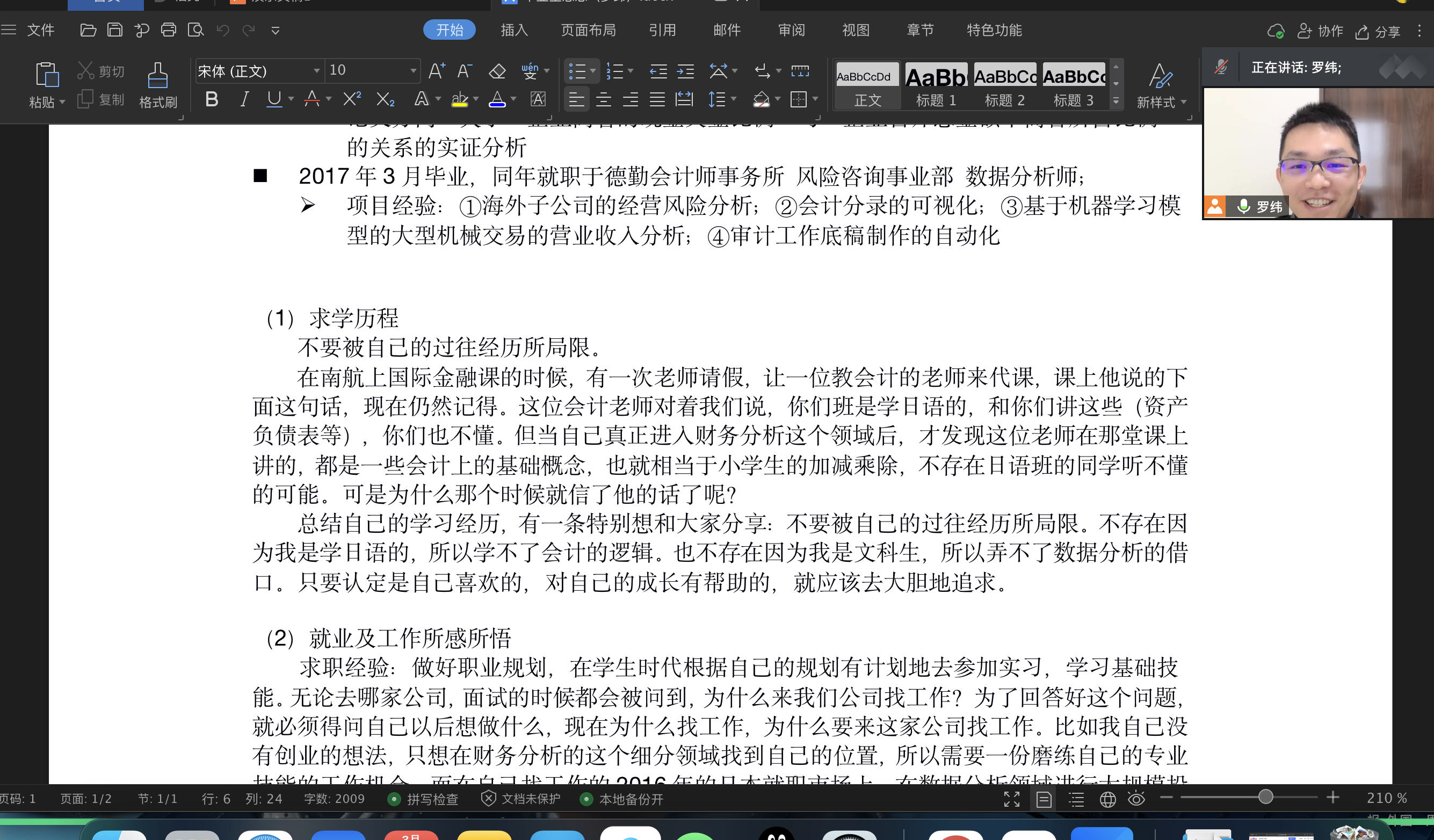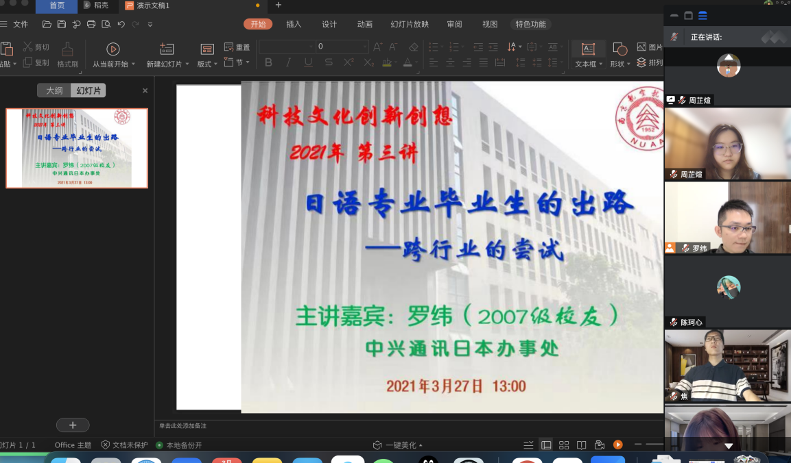 3月27日下午1:00,dg百家乐在线试玩平台 日语系科技文化创新创想课程第三讲通过腾讯会议模式开启,主题为《日语毕业生的出路——跨行业的尝试》,主讲人为07级日语系校友罗纬,日本一桥大学和东京大学双硕士,曾就职于日本德勤会计师事务所,任职风险咨询事业部数据分析师,现就职于中兴通讯日本办事处。