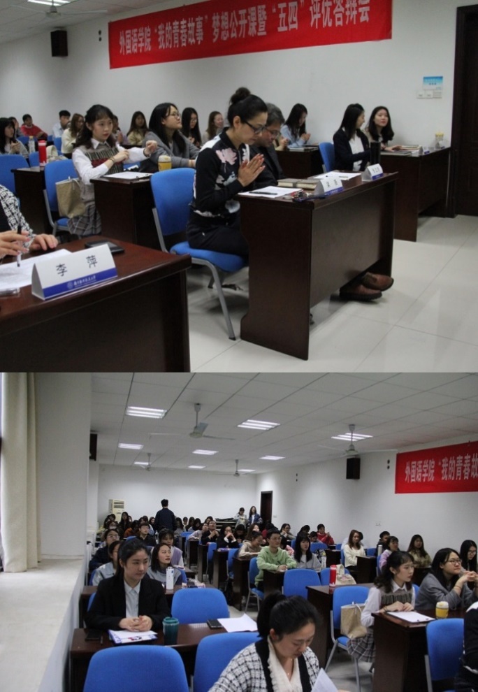 4月21日,dg百家乐在线试玩平台 “我的青春故事”梦想公开课暨“五四”评优答辩会在dg百家乐试玩 111教室隆重举行。院党委副书记梁薇,英语系主任张立新,院团委书记、研究生辅导员李萍,本科生辅导员盛嘉贤、彭欢作为评委参与了这次答辩。