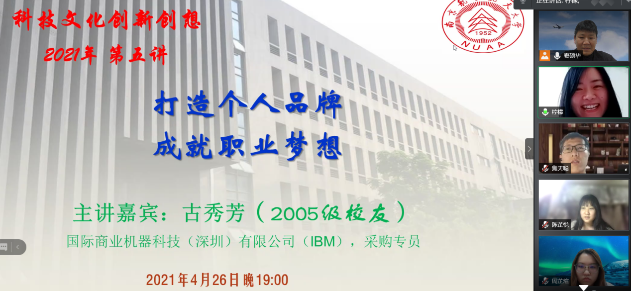 4月26日晚上7:00,dg百家乐在线试玩平台 日语系科技文化创新创想课程第五讲通过腾讯会议模式开启,主题为《打造个人品牌,成就职业梦想》,主讲人为05级日语系校友古秀芳,现任国际商业机器科技(深圳)有限公司(IBM)采购专员。