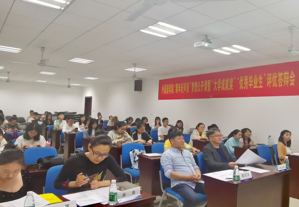 5月7日下午,dg百家乐在线试玩平台 开展“青年好声音”梦想公开课暨“大学成就奖”、“优秀毕业生”评优答辩会。院党委副书记梁薇,英语系主任张立新,日语系主任窦硕华,院团委书记李萍,本科生辅导员盛嘉贤、彭欢作为评委参加了这次答辩,参加本次评优答辩会的还有各年级学生代表。
