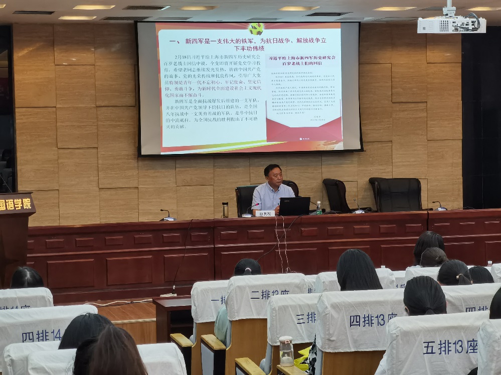 讲座开始后,孙其松首先为同学们介绍了新四军的历史,指出在抗战期间,新四军英勇抗敌,浴血奋战,成为抗击侵华日军的中流砥柱。接下来又以歌引题,为同学们播放了新四军军歌,介绍“铁的信念,铁的意志,铁的团结,铁的纪律,铁的作风”的新四军精神。最后,孙其松再次回归主题,向同学们强调弘扬铁军精神,为新时代全面建设社会主义现代化国家贡献青春力量。鼓励同学们要爱国,爱家,爱校;要牢记为人民服务的宗旨,时刻想着人民群众;要心中有祖国,心中有集体,心中有他人;要艰苦奋斗,勇往直前;要苦学知识增才干,勇于担当做贡献。