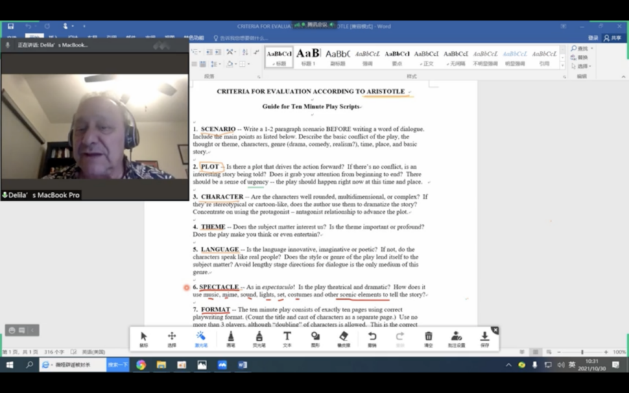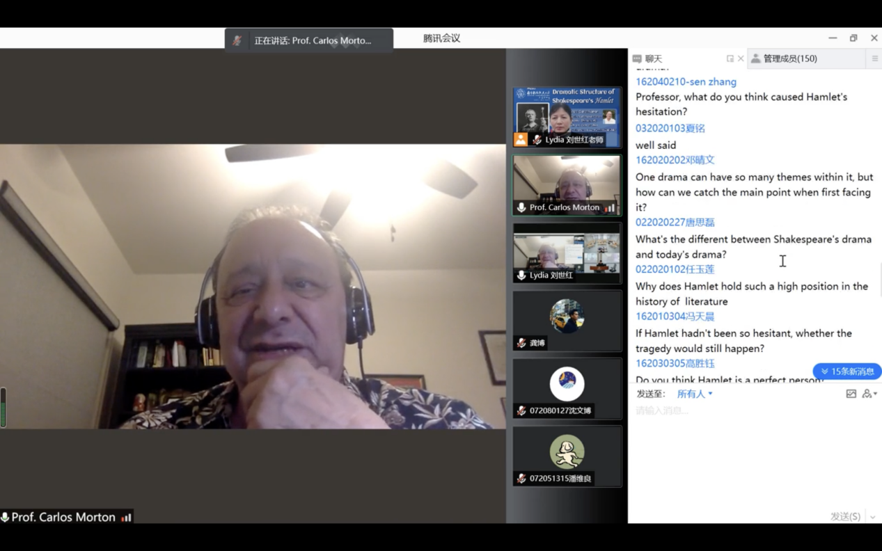 讲座由dg百家乐在线试玩平台 国际联络中心主任刘世红副教授主持,共分为三个环节。第一环节为电影赏析,刘世红播放并分析1948年经典版的哈姆雷特电影的重点片段,让大家对作品情节有更多的了解。第二个环节中,Carlos Morton教授结合《哈姆雷特》为大家介绍了主角、情节、反面角色、事件、矛盾冲突、高潮等戏剧要素,随后又为大家讲解了基于亚里士多德戏剧理论的对于戏剧的评价标准。第三个环节为教授与学生的互动环节,同学们在软件聊天室或者开麦积极发言分享观点,主要围绕《哈姆雷特》相关剧情、创作背景、莎士比亚自身经历、以及剧作的现实意义等话题展开。Carlos Morton教授就同学们的问题一一给出解答,互动积极、气氛活跃,讲座共持续两个半小时。