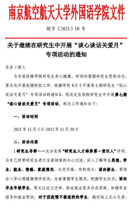 dg百家乐试玩 领导高度重视此次专项活动,院党委会专题研究讨论了学生心理健康教育工作,院党政联席会讨论出台了《关于继续在研究生中开展“谈心谈话关爱月”专项活动的通知》,分别明确院领导、研究生导师、研究生辅导员以及各系(部)在推动学生健康发展过程中的责任与要求,分层分类开展工作,全员参与、全面覆盖。同时坚持以人为本,发挥宿舍、年级心理气象员在学生心理健康教育中的积极作用,联合研究生会增设“心灵信箱”纾解学生情绪。