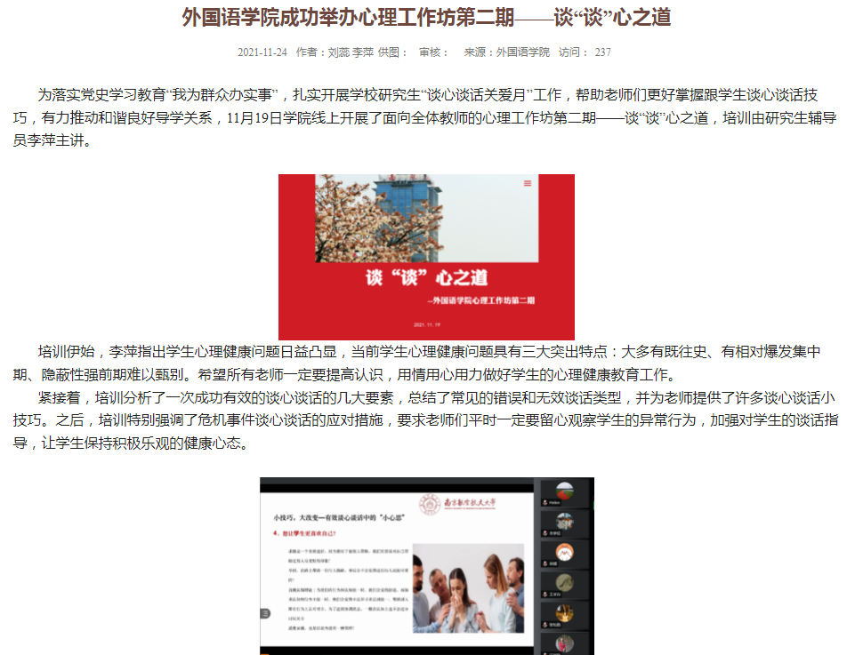 近期,dg百家乐在线试玩平台 通过导师谈心谈话关注、辅导员进宿舍进教研室、 “心理工作坊”专题培训、dg百家乐试玩 师生座谈会等多种形式,分层次、分类别、有针对开展研究生“谈心谈话关爱月”专项活动。dg百家乐试玩 领导、研究生导师、辅导员共同参与,扎实推进研究生心理健康教育工作。