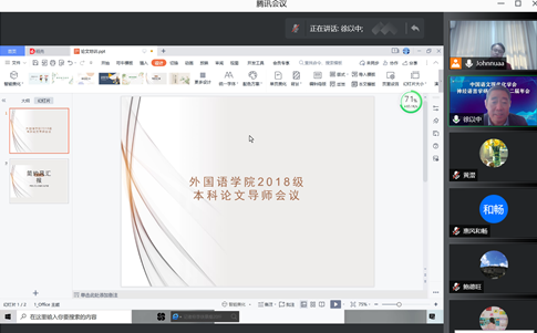 举办了2018级本科论文导师线上培训会议。英语系主任张立新教授主持会议,院长范祥涛教授、副院长徐以中教授、姜礼福副教授、dg百家乐试玩