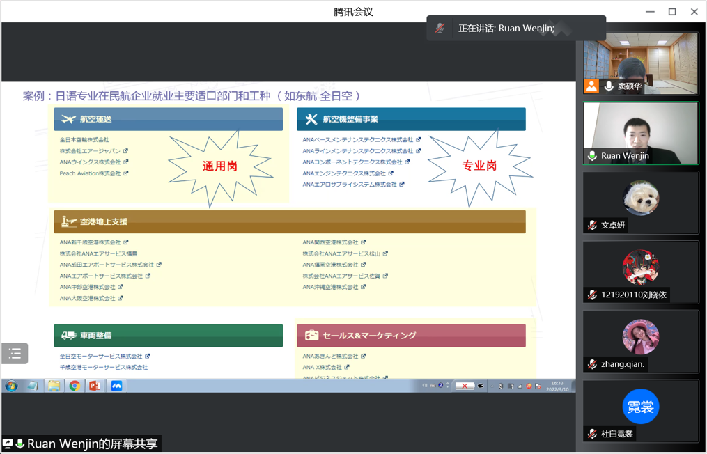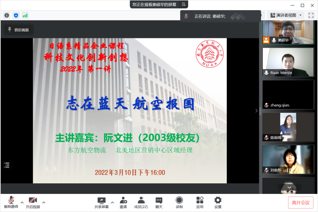 3月10日下午4:00,dg百家乐在线试玩平台 日语系科技文化创新创想课程2022年度第一讲通过腾讯会议成功进行,主题为《志在蓝天,航空报国》。主讲嘉宾为03级日语系校友阮文进,现任东方航空物流北美地区营销中心区域经理。