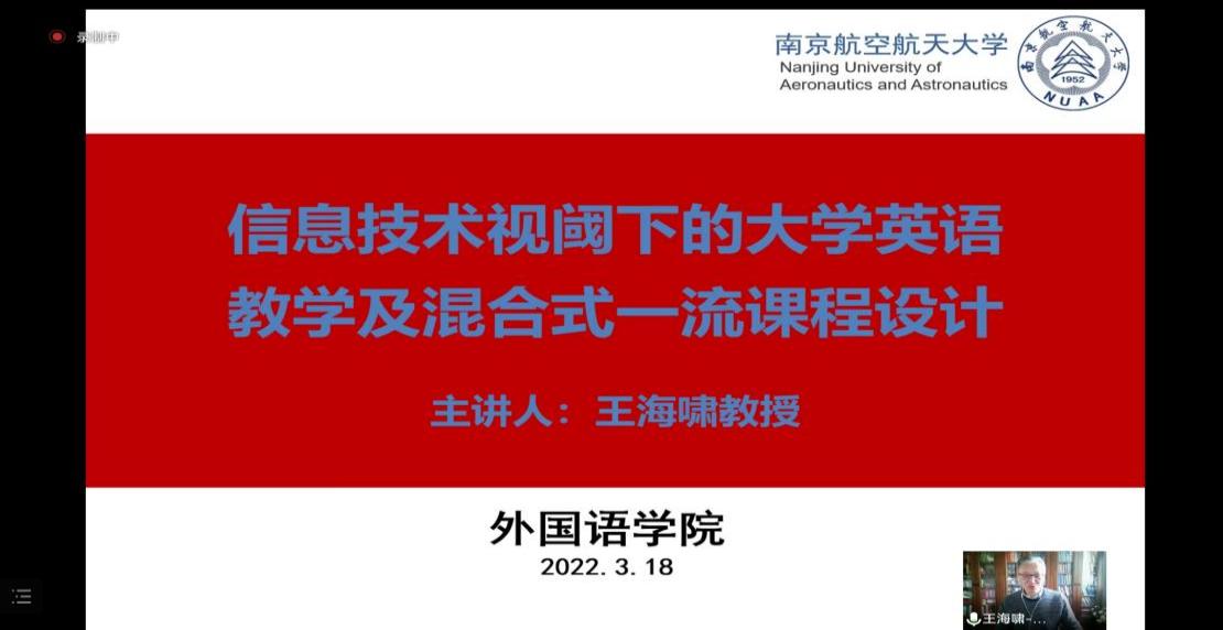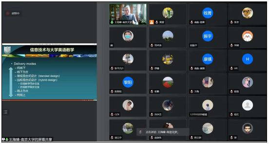 3月18日下午,dg百家乐在线试玩平台 邀请教育部高等学校大学外语教学指导委员会委员、南京大学教授王海啸教授做题为“信息技术视阈下的大学英语教学及混合式一流课程设计”的线上讲座,讲座由dg百家乐在线试玩平台 副院长徐以中主持,院长范祥涛、dg百家乐在线试玩平台 教师及来自全校其他各dg百家乐试玩 的60多位老师全程参加了讲座。