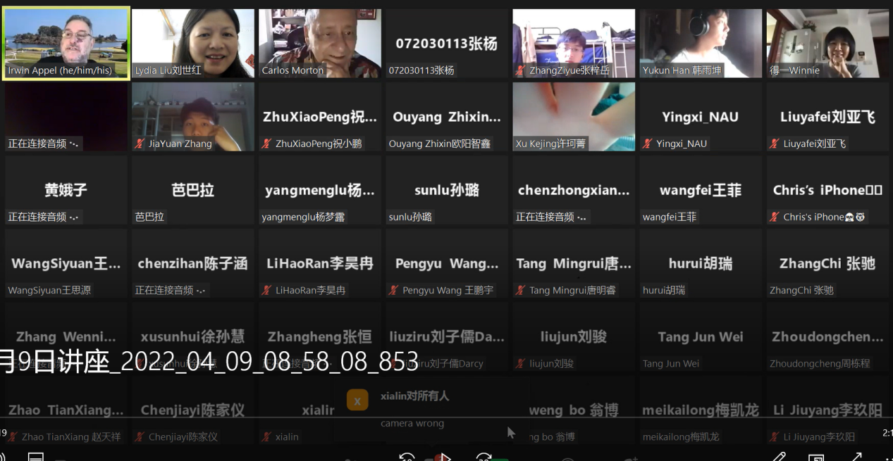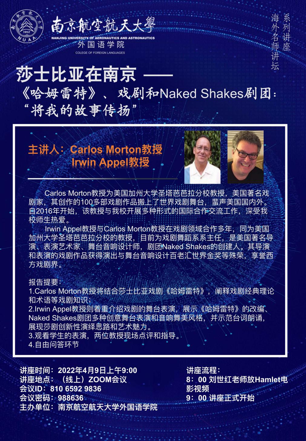 4月9日上午,dg百家乐试玩 邀请美国加州大学圣芭芭拉分校Carlos Morton教授和Irwin Appel 教授,开展了题为“莎士比亚在南京” 之“《哈姆雷特》、戏剧和Naked Shakes剧团:‘将我的故事传扬’”的线上讲座。我校及南京农业大学等共计100多名师生参加。