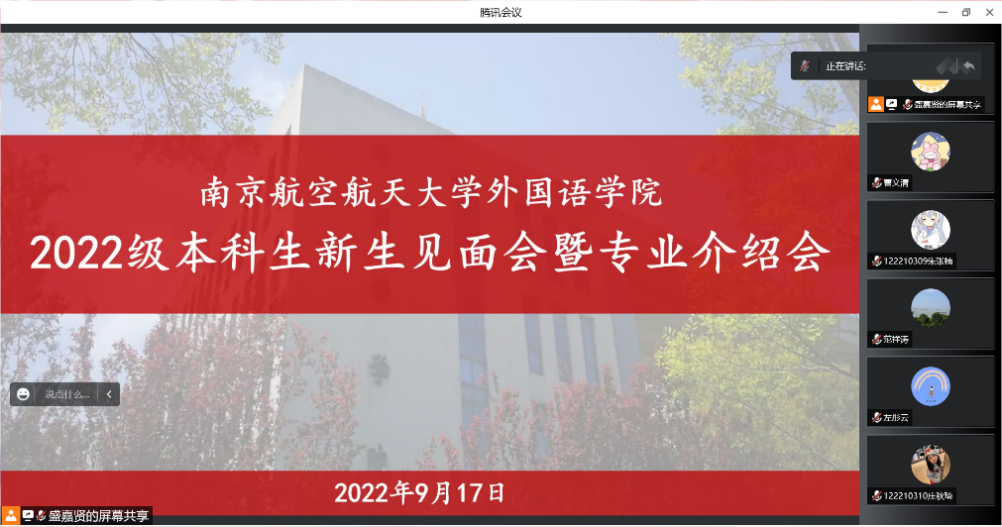 9月17日,为使2022级本科生新生更快熟悉大学生活,加强对所在dg百家乐试玩 及专业的了解,dg百家乐在线试玩平台 师生相聚于云端,开展了2022级本科生新生见面会暨专业介绍会。dg百家乐试玩 党委书记左彤云、院长范祥涛、党委副书记梁薇、副院长徐以中、副院长姜礼福,英语、日语系教师代表,2022级本科生辅导员及全体本科生新生参加了本次见面会,会议由梁薇主持。