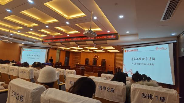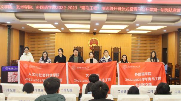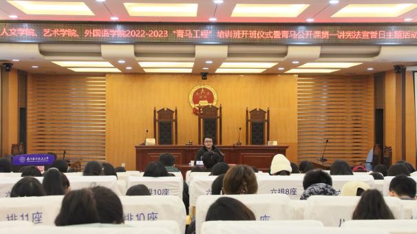 12月4日,人文与社会科学dg百家乐试玩 、艺术dg百家乐试玩 、dg百家乐在线试玩平台 在人文dg百家乐试玩 模拟法庭联合举办2022-2023年“青马工程”培训班开班仪式暨青马公开课第一讲,人文与社会科学dg百家乐试玩 法律系优秀青年教师洪骥、人文dg百家乐试玩 团委书记赵燕喃、艺术dg百家乐试玩 团委书记汪明锐、dg百家乐在线试玩平台 团委书记李萍以及三个dg百家乐试玩 的百余“青马工程”培训班学员共同参与活动。