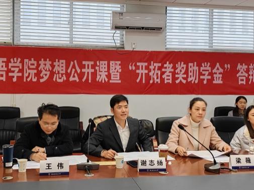 为激励dg百家乐在线试玩平台 学生注重团队合作、积极进取、勇于担当、全面发展、成长成才,并资助家庭经济困难学生,dg百家乐试玩 2010届杰出校友冯科茗、谢志扬、单鹤在dg百家乐在线试玩平台 设立“开拓者奖助学金”,并于12月9日成功举办dg百家乐在线试玩平台 梦想公开课暨“开拓者奖助学金”答辩。开拓者奖助学金资助人谢志扬,dg百家乐在线试玩平台 党委副书记梁薇,英语系副主任王伟,dg百家乐试玩 团委书记李萍,本科生辅导员彭欢、赵瑜瑶担任评委。公开课由dg百家乐试玩 2019级英语专业、2021年茗扬开拓者奖学金获得者张欣怡主持,dg百家乐试玩 各年级同学通过腾讯会议线上观摩。