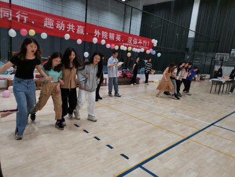 第一个项目是“四人五足跑”,每队队员在起点处并排站好,系上绑带,听到命令,向终点进发,用时最短者将胜出。虽然是趣味竞赛,但是各队师生认真训练,比赛中口号响亮、步调一致,勇敢向前冲,跑出了师生协作的默契。