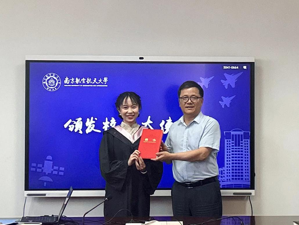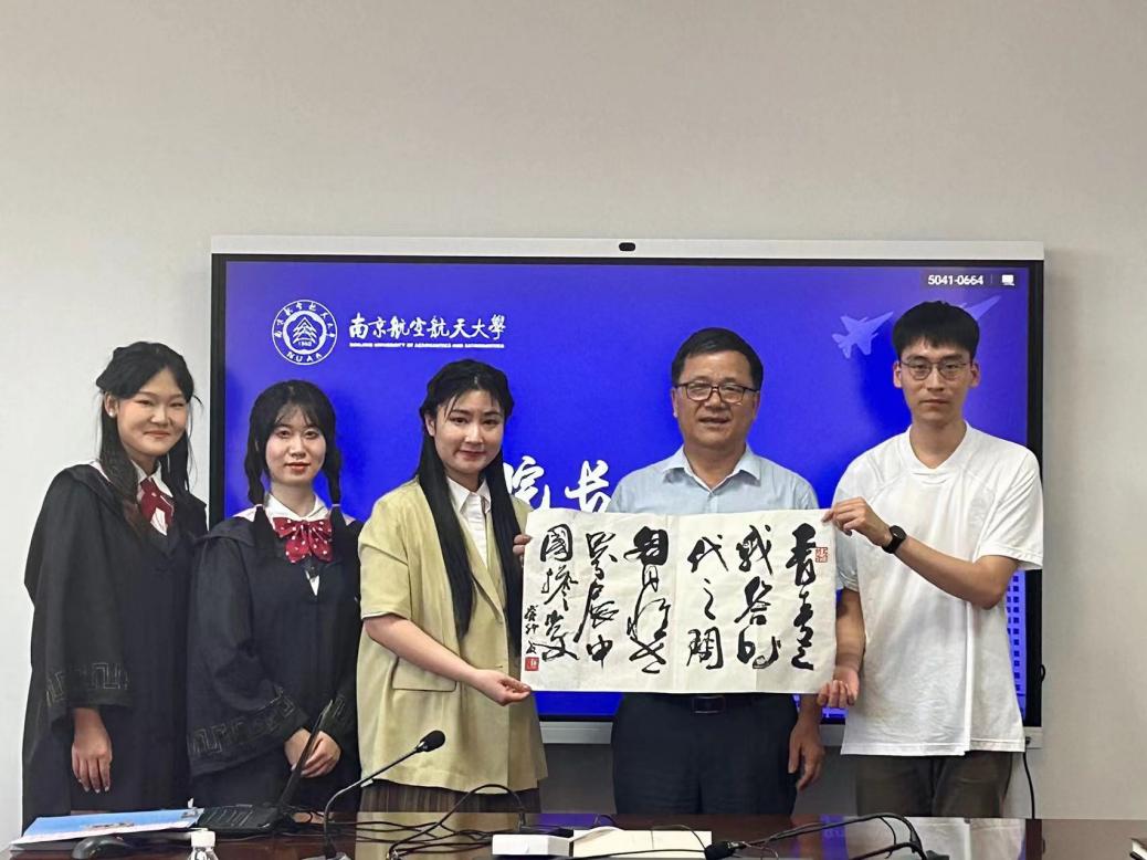 范祥涛向校友大使朱芷苑颁发聘书,希望2023届毕业生不忘dg百家乐试玩 背景,将南航外院当做永远的家园,欢迎毕业生们随时“回家看看”。