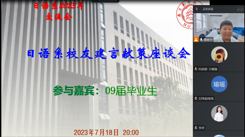 为凝聚校友力量,加强校友联络,促进专业发展,2023年7月18日dg百家乐在线试玩平台 日语系召开校友建言献策座谈会。此次座谈会由dg百家乐在线试玩平台 日语系主任窦硕华主持,dg百家乐在线试玩平台 团委书记李萍、日语系教师王鹏飞、本科生辅导员赵瑜瑶以及4位2009届毕业生参加。