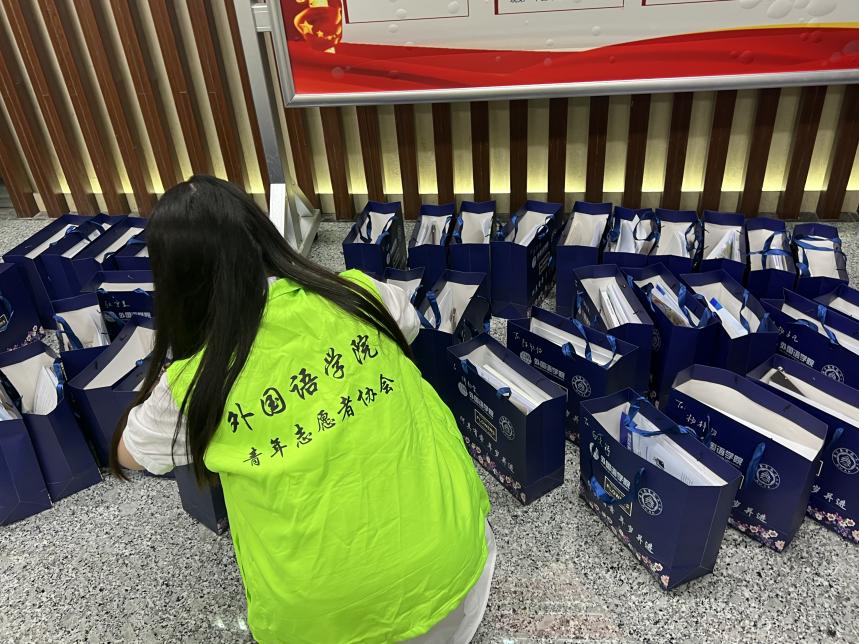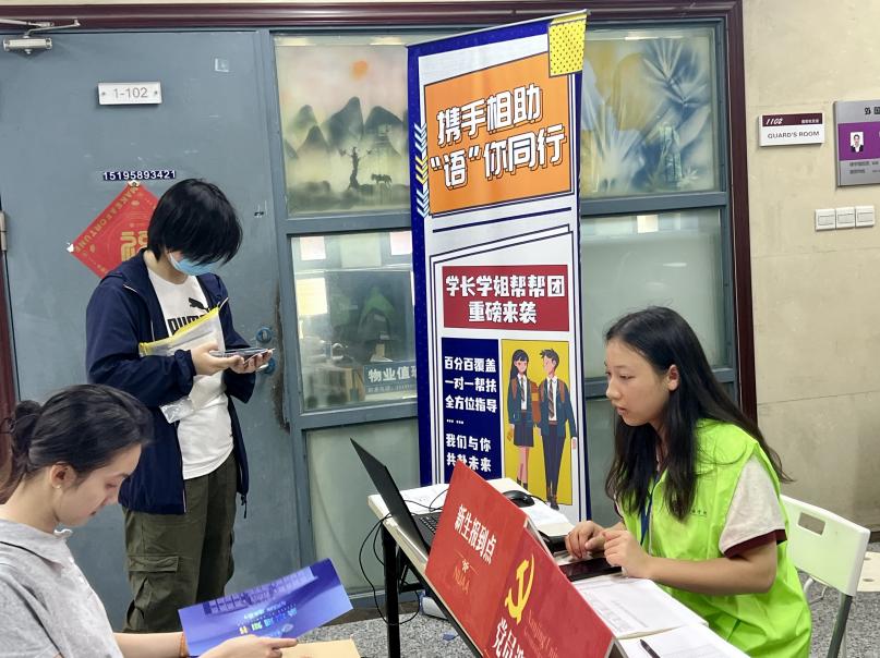 dg百家乐在线试玩平台 楼外,志愿者们手举指示牌,笑意盈盈,展现出外院学子的热情与风采。