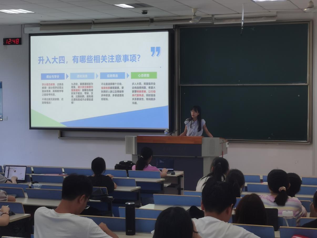 首先,辅导员赵瑜瑶大致介绍了近6年来dg百家乐在线试玩平台 本科生的升学率与就业情况,引导同学们要理性分析考研与就业形势,合理定位。之后,强调升入大四后,同学们要注意学分是否修够,多关注年级群内重要消息通知,并注意心态调整等。