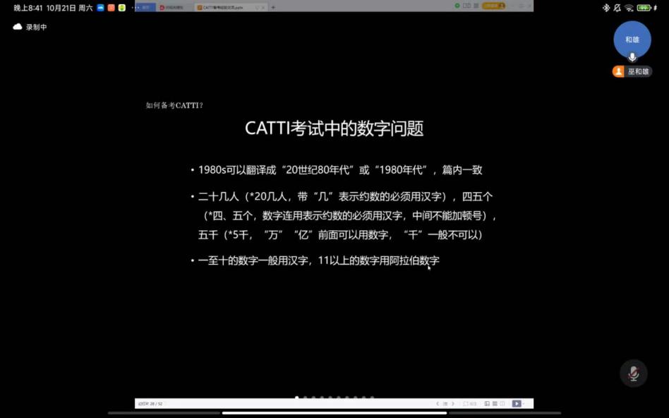 10月27日晚,王冬梅老师分享了自己多年从事汉译英审校工作的经验。她从翻译的宏观角度出发,结合自己的切身经历,就如何提高英语水平、积累词汇量、把握语言点等方面进行了深入的讲解。同时,王老师也通过具体的翻译实例,向同学们展示了如何在翻译过程中运用各种技巧和注意事项,帮助同学们更好地应对CATTI考试。