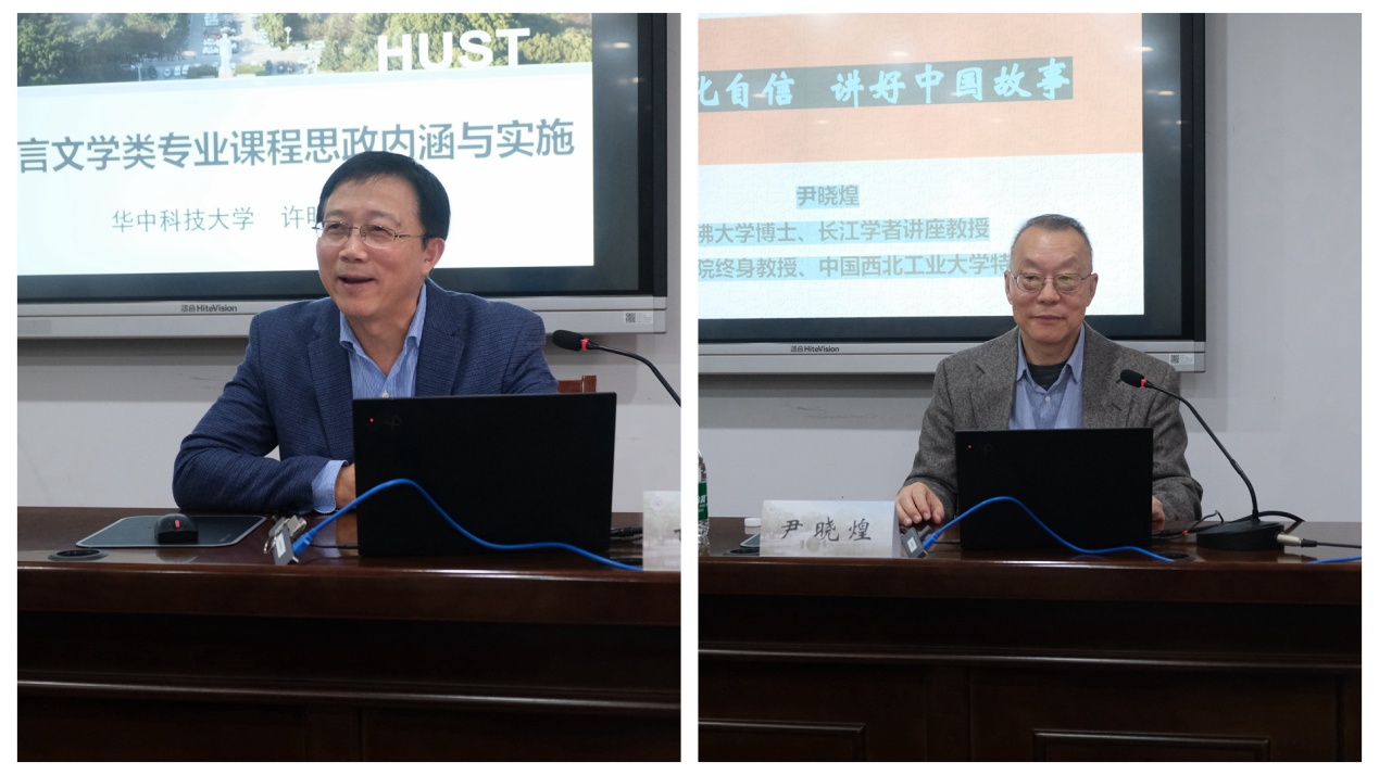 揭牌仪式之后,联盟邀请了华中科技大学dg百家乐在线试玩平台 院长许明武教授,长江学者讲座教授、西北工业大学dg百家乐在线试玩平台 博导尹晓煌教授带来了外语课程思政学术报告。线上线下150余人参加了此次报告会。
