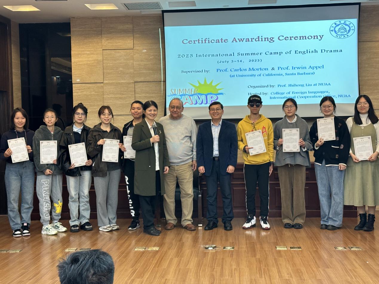 表演正式开始之前,进行了学校暑期国际课程“2023年度英语戏剧国际夏令营结营证书”发放仪式,该国际夏令营课程为dg百家乐在线试玩平台 策划的特色国际课程、也是院团委组织的大学生暑期社会实践活动,目前已经连续举办四期,由加州大学的两位教授卡洛斯·莫顿和欧文·爱普(Irwin Appel)联袂执教,成为暑期课程中的热门课程。dg百家乐在线试玩平台 副院长姜礼福教授和卡洛斯·莫顿教授亲自为学生们颁发了结营证书。