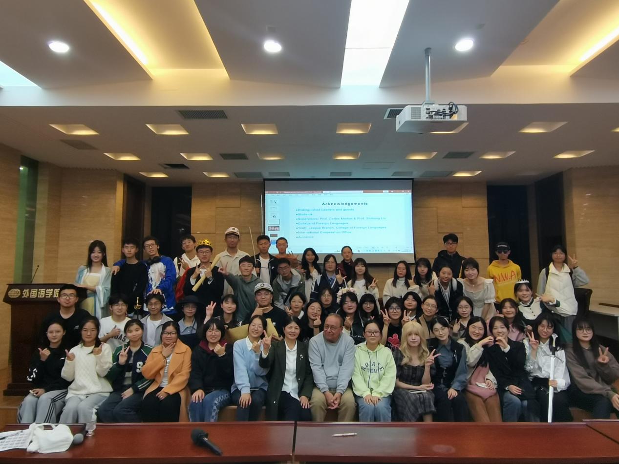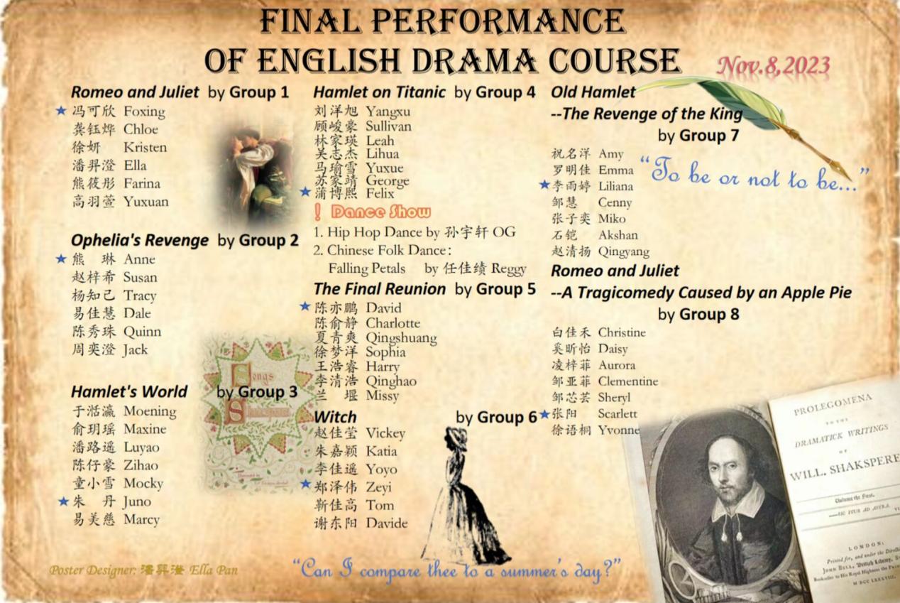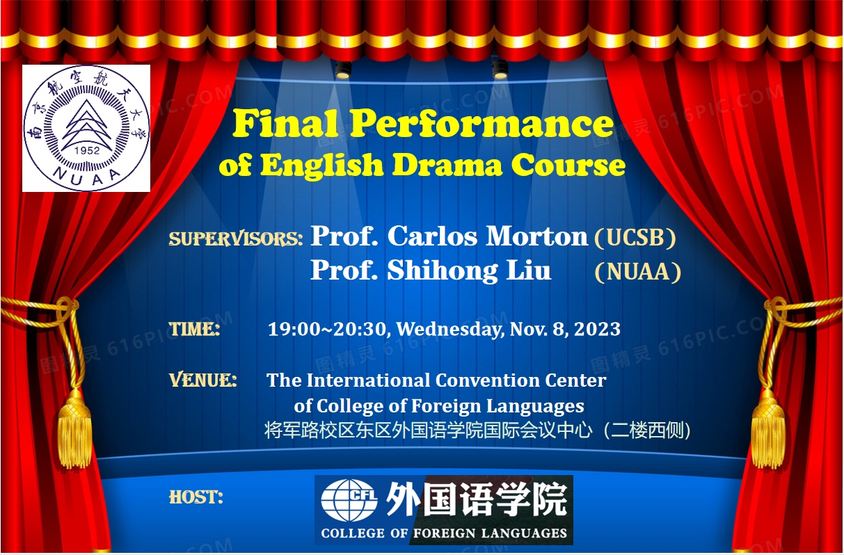 2023年11月8日晚,dg百家乐在线试玩平台 在国际会议中心成功举办了校通识课《英语戏剧》课程汇报演出。该课程由美国著名戏剧家、加州大学卡洛斯·莫顿(Carlos Morton)教授和dg百家乐在线试玩平台 副教授刘世红联合授课。通过该课程,学生系统学习了戏剧的发展史和理论知识,重点分析研究了英国最伟大的戏剧家莎士比亚的四部经典戏剧、并进行模仿和改编,最后将自己的改编作品搬上舞台。