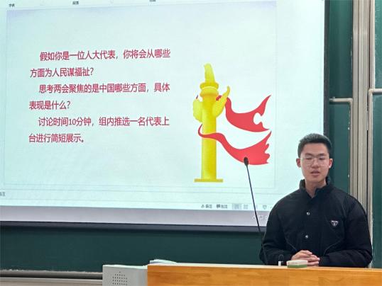 最后,参会同学就“我为两会建言献策”进行交流。同学们被分为5人小组进行讨论,思考假如有机会成为一位人大代表,将会从哪些方面为人民谋福祉?全国“两会”聚焦的话题是国家发展的哪些方面,具体表现是什么?各小组踊跃发言,表达对新时代新发展的关注和期许。