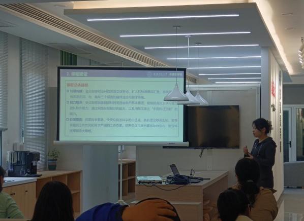 徐智鑫首先简要介绍了《科技英语翻译》课程,强调了以“学生发展”为中心的教学理念,随后从教学团队、课程建设及该课程未来的发展举措等方面进行详细的分享。