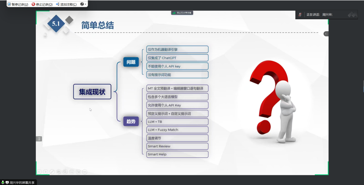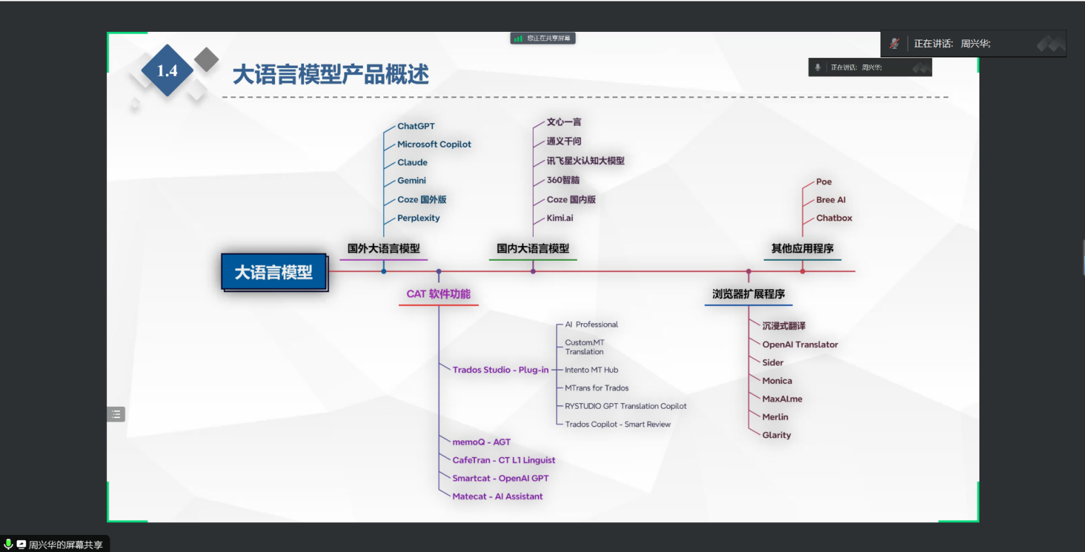 如今,人工智能的时代大势引发了深刻的技术革命、教育变革和数据革命,同时翻译技术也成为了翻译教学和实践中不可分割的部分,进一步推动了语言服务行业和高校教育的创新变革,促进了技术与人的和谐共生。为提升语言服务行业各方对翻译技术的认识和应用能力,加强语言服务人才的技术素养,加速语言技术成果的高效转化,2024年4月1日晚,南航dg百家乐在线试玩平台 MTI教育中心邀请了翻译技术专家周兴华老师给2023级研究生带来了极具前沿特色的一堂翻译技术课。本次课程,周老师给大家带来了大语言模型与CAT软件的集成及实践应用系列课程,侧重分析和探讨了其应用优势与应用场景。