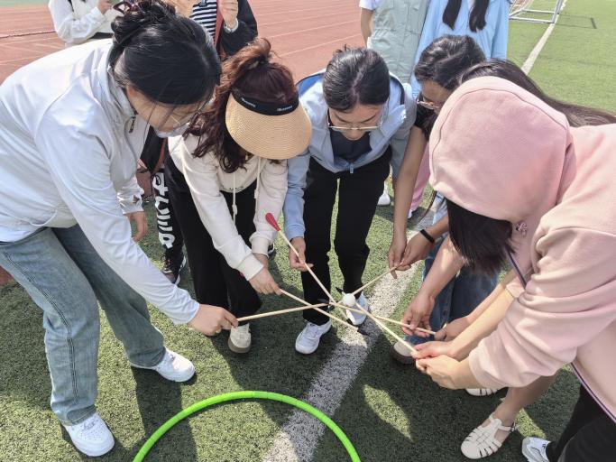 师生默契,携手同行。在“五人六足”中,经过几轮练习,师生们逐渐协调好了整个队伍行进的节奏。口哨声响,各个队伍嘹亮的行进口号声与观众们的呐喊声此起彼伏。师生们在协调配合中加深导学情谊,在团结争先中彰显体育精神,赛场气氛活泼热烈,笑语连连。