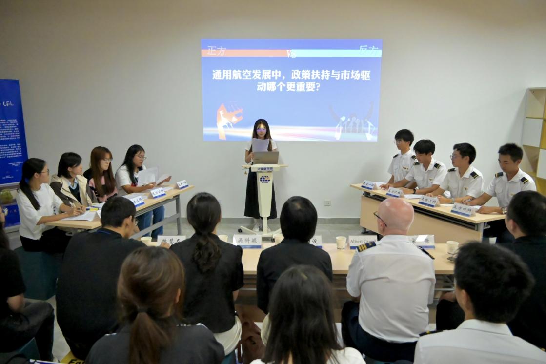 以“通用航空发展中,政策扶持与市场驱动哪个更重要”为主题的辩论正式开始,在主持人的引导下,辩手们用扎实的语言功底和严密的逻辑论述了自己的观点,双语辩论和专业知识使得评审老师们频频点头,双方的精彩辩论为大家留下了深刻的印象。