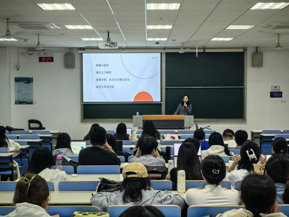 11月3日晚,dg百家乐在线试玩平台 周蕾博士参加dg百家乐在线试玩平台 “航家论坛——外国语言文学青椒学术沙龙”,并作了题为“现代主义跨媒介研究”的学术报告。dg百家乐在线试玩平台 100余名研究生参加学习。