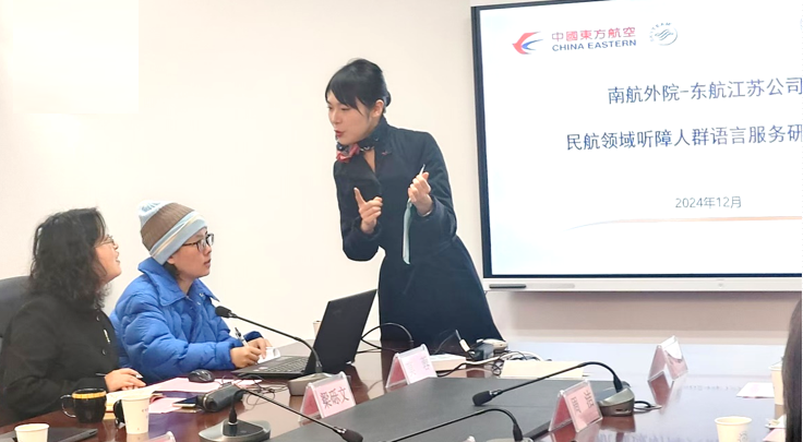 12月19日,dg百家乐在线试玩平台 与东航江苏公司联合举办民航领域听障人群语言服务研究交流会。东航江苏公司培训中心老师文洪、张玥、东航凌燕组长贺炫及客舱乘务各分部代表与dg百家乐在线试玩平台 院长徐以中、党委副书记吴科颖、团委书记李萍、英语系主任张立新、航空英语研究中心主任王孝存、研究生公共外语教学部教师梁砾文副教授、大学外语教学部许阳博士和部分本科、研究生学生代表参与交流,会议由王孝存主持。
