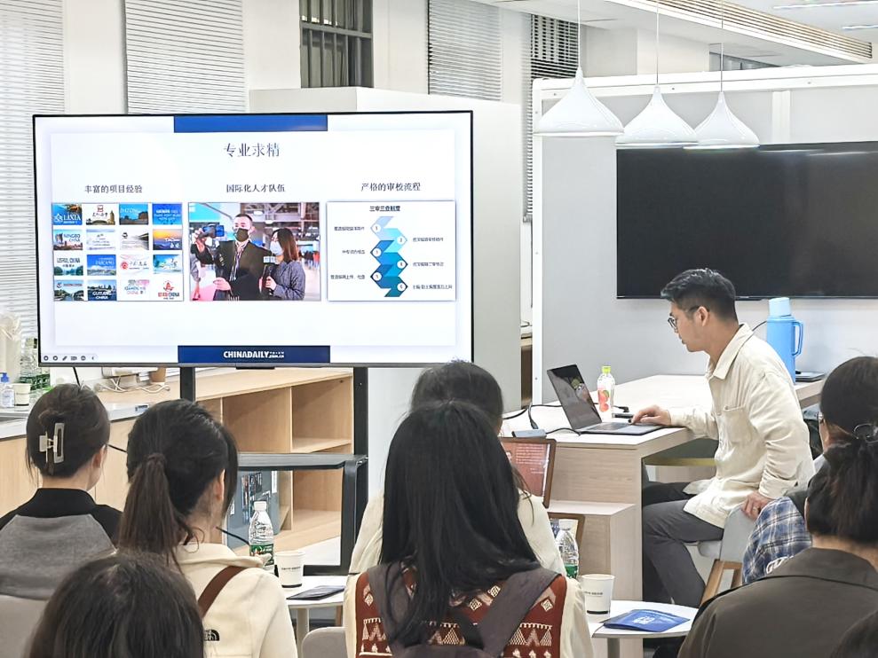 随后,刘夏为同学们详细介绍了企业相关信息。中国日报网作为国家六大重点媒体网站之一,是集新闻信息、娱乐服务为一体的综合性新闻媒体网站,主要服务于国内外主流中高端读者群,备受海内外各领域高层次读者青睐,也是沟通中国与世界的网上桥梁之一。他还着重介绍了无锡公司的优势,涵盖其专业精深的团队、科技前沿的探索以及产品创新的成果。