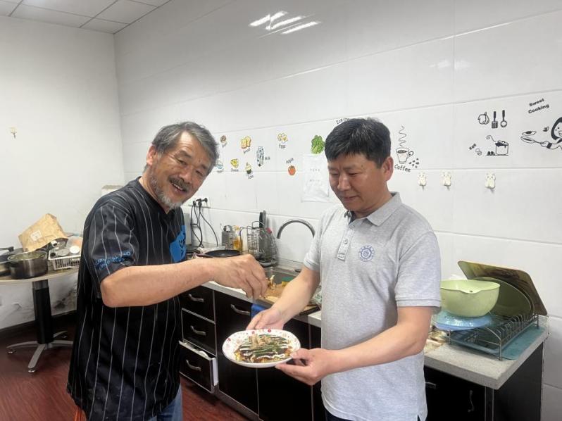 中午时分,外教北村忠吉老师在“快乐厨房”带领同学们制作了日本传统美食大阪烧与甜点松饼。在过程中,他耐心地讲解制作步骤,不时用幽默的语言调动气氛,同学们一边认真聆听,一边协助北村制作美食。