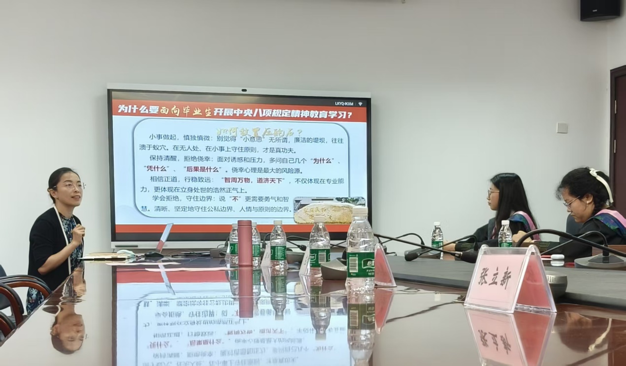 同日,毕业生座谈会后,dg百家乐试玩 副书记吴科颖为全体毕业生党员讲授“严守八项规定守初心,永葆清廉本色赴前程”主题党课。通过梳理中国共产党的作风建设发展历程,强调新时代青年当以清廉为人生的压舱石,护航未来发展,在人生新阶段永葆清廉本色。这堂生动的毕业生党课,为青春远航注入坚定信仰力量。